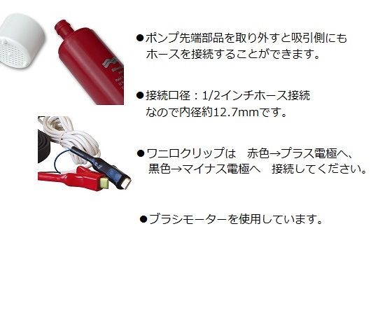 ●完全潜水が可能です。●連続運転が可能です。●最大流量(L/min):18●揚程(m):9.7●サイズ:Φ38×165mm●重量:500g●対応流体:清水、海水、軽油●対応流体温度:清水/~80℃、海水/~80℃、軽油/~40℃●接続口径:1/2インチホース接続●電源:12V DC●定格電流値:4.5A●電源ケーブル長さ:4m