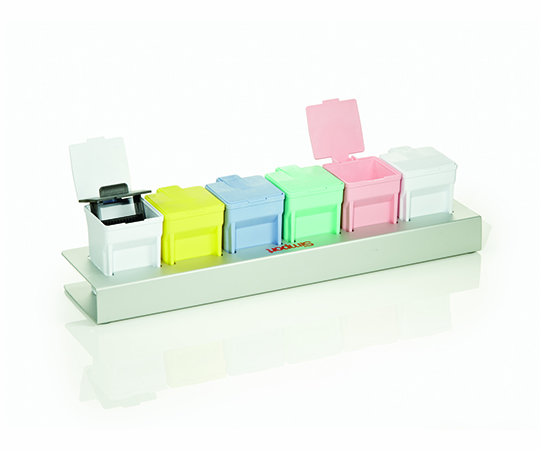 ●特殊染色・凍結切片等に適したスライド染色バットです。●アルコール・キシレンを含むほとんどの染色剤に耐性があります(フェノール・ヨウ素・塩化第二鉄は除く)。●腐食する金属を使用していません。●底部は幅広で安定しており、内側を凹ませたデザインにより試薬は80mL程度の充填で済みます。●グラム染色は非推奨です。●仕様:5色セット(ホルダー付)●入数:1セット●材質:アセタール●サイズ:ジャー/64×76×92mm、ホルダー/425×102×38mm●セット内容:ジャー(青・緑・ピンク・黄×各1個、白2個)、ホルダー(M906)×1個●ジャー容量:最大80mL●使用温度範囲:-80~+30℃●オートクレーブ不可