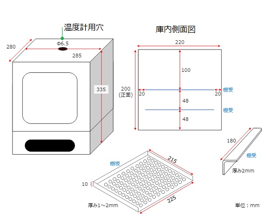 ●コンパクトなサイズのインキューベーターです。●底面外寸はわずか30cm角未満なので、小さいスペースにも設置可能です。●大きな窓のため、扉を開けることなく内部の観察が可能です。●操作は温度の設定のみのシンプルな操作で使用できます。●容量(L):10●設定温度範囲(℃):室温+5~60●自然対流方式●温度設定単位:0.1℃●温度分布幅:3℃(37℃設定時)●温度制御方式:PID制御●センサー:白金測温抵抗体Pt100Ω●内寸法:230×220×200mm●外寸法:285×280×335mm●棚ピッチ:48mm(最大2段)●電源:AC100V 50/60Hz●電源コード長:2m●コンセント形状:3P●重量:8.3kg●付属品:棚板×1枚●安全装置:過昇温保護温度ヒューズ、過電流保護ヒューズ