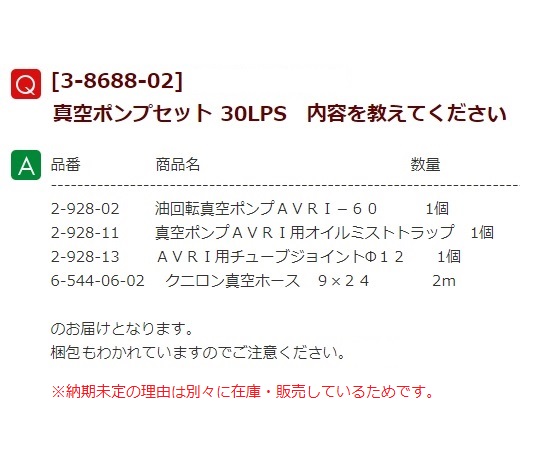 ●真空乾燥時に必要な標準的な油回転真空ポンプと真空ホースのセットです。●排気速度(L/min):60/72(50/60Hz)●真空ポンプ:AVRI-60●電源:AC100V 50/60Hz(コード長1.5m)●セット内容:真空ポンプ、オイルミストトラップ、チューブジョイント、真空ホース2m(φ9×φ24mm)●選定対応機種:AVO-250サイズ・-310サイズ・DVS-250・-310●※水等、液体成分を多く含むサンプルの乾燥には別途冷却トラップをご使用ください。