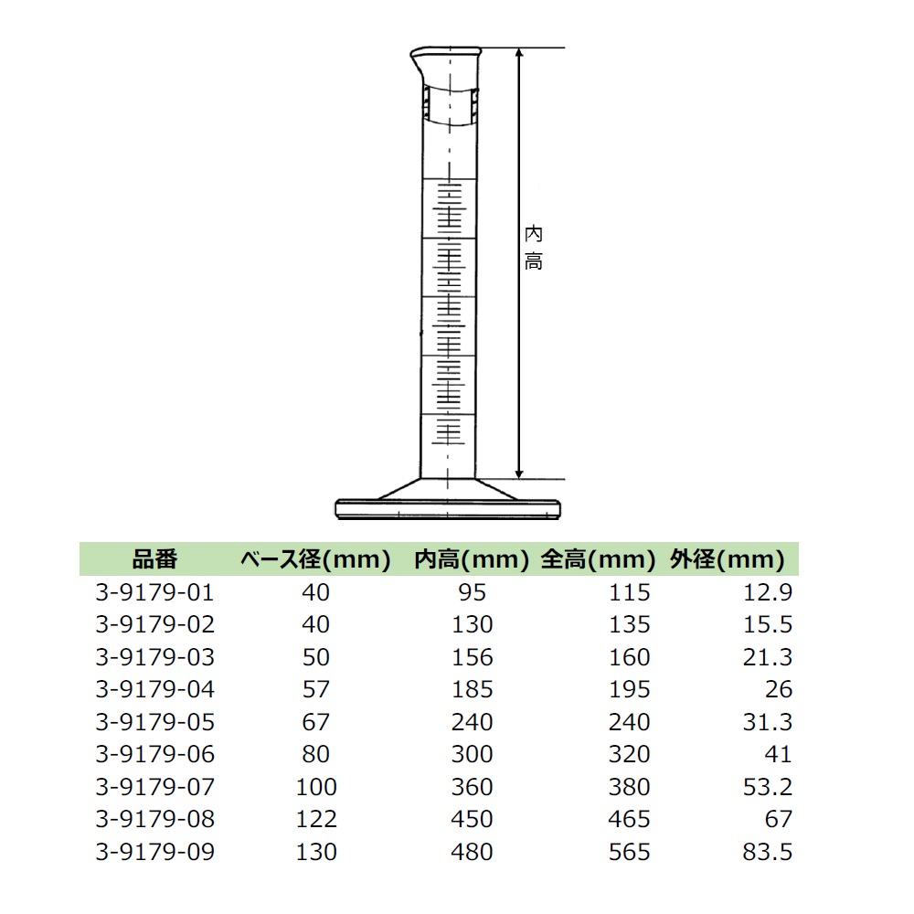 ●見やすい青色の目盛です。●土台は六角形で転がりにくい仕様です。●容量(mL):250●一目盛(mL):2●精度(±mL):1●外径(Φmm):41●全高(mm):320●材質:硼珪酸ガラス●ISO4788クラスA