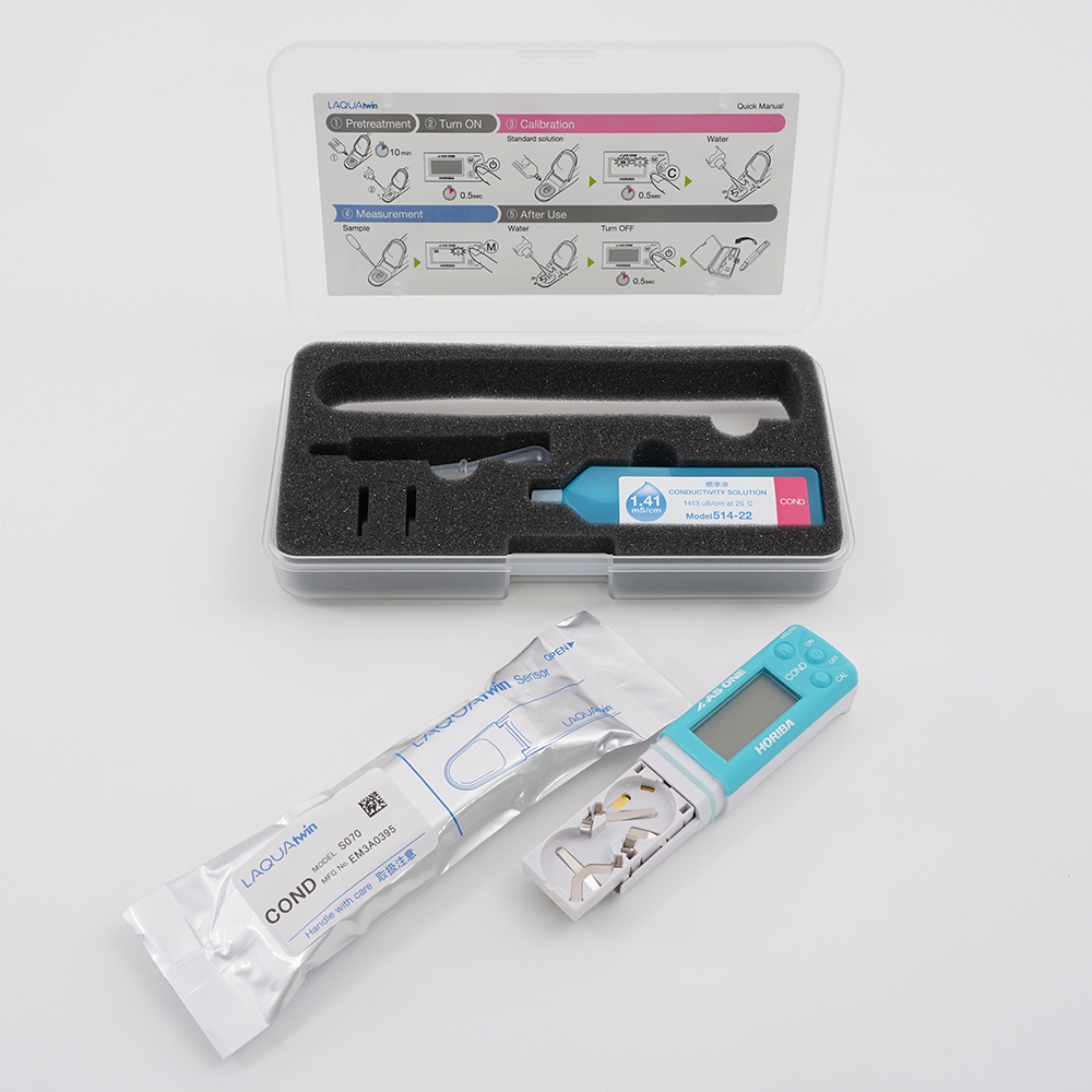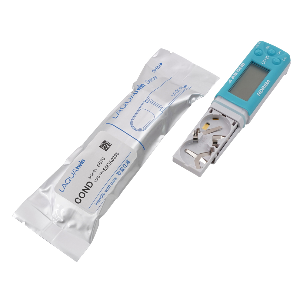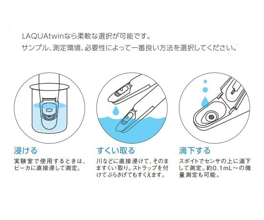●TDS換算測定も可能なLAQUAtwin電気伝導率計です。●微量サンプル(0.12mL~)での滴下測定が可能です。●滴下、浸漬、すくい取り等、多彩な測定が可能です。●バックライト液晶を搭載し、暗い場所でも測定値の確認が可能です。●コンパクトボディに加え、標準液ボトル入の専用ケースで持ち運び。防水機能で屋外でも安心。●測定範囲:導電率/0~199.9mS/cm (0~19.9S/m)、TDS/0~9900ppm●分解能●▼①0~199μS/cm:1μS/cm●▼②200~1999μS/cm:1μS/cm●▼③2.00~19.99mS/cm:0.01mS/cm●▼④20.0~199.9mS/cm:0.1mS/cm●温度表示範囲:0~50℃/0.1℃●校正:最大3点●精度●▼精度レンジ①~③に対して±2%F.S.●▼レンジ④に対して±5%F.S.●主な機能●▼自動レンジ切替、標準液自動認識、温度換算(25℃温度換算係数2%固定)、●▼温度センサ調整機能、オートホールド、オートスタビリティ機能、オートパワーオフ(30分)、●▼バッテリー残量表示、センサ交換可能、TDS換算機能(Factor(0.4~1.0)、442、NaCl、EN27888)●防水性:IP67●使用環境:5~40℃、85%相対湿度以下(ただし結露しないこと)●電源:CR2032ボタン電池×2個(テスト用付属)●外形寸法/重量:164mm×29mm×20mm(突起部を除く)/約50g(電池を除く)●付属品:スポイト1本、取扱説明書、クイックマニュアル、保管ケース、電気伝導率標準液(1.41mS/cm) 1本(14mL)、処理液 1本(14mL)●別売消耗品●▼1-3020-31 ツインCONDメーターⅡ (コンパクト電気伝導率(導電率)計) 用導電率センサー S070●▼1-3020-52 ツインCONDメーターII(LAQUAtwin・防水型)用導電率標準液 514-23●▼1-3020-53 ツインCONDメーターII(LAQUAtwin・防水型)用導電率標準液 514-22●▼65-0509-39 ツインCONDメーターII(LAQUAtwin・防水型)用 処理液 6本入 514-20