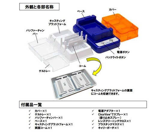 ●安全な青色ライトでDNAの分離を観察でき、スマートフォンやカメラでの撮影ができます。●臭化エチジウムやUVライト、高電圧が不要です。●ゲルの作成から観察までオールインワンでコンパクトサイズです。●サイズ(mm):230×100×70●重量(g):350●ゲルサイズ:60×60mm●バッファー容量:25mL●ウェル数:9または13●電源:AC100~240V 50/60Hz