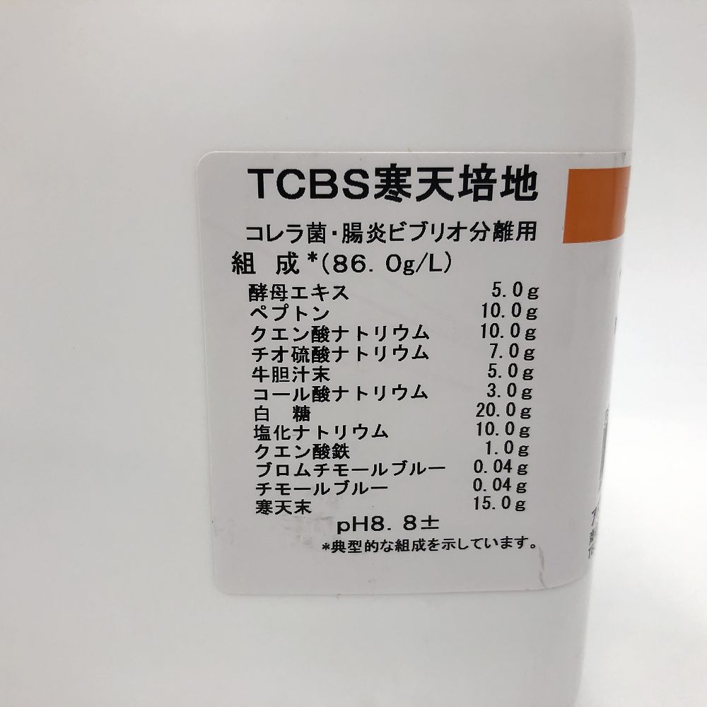 ●適合:ビブリオ属分離用●内容量:300g●組成(培地86.0g/L):酵母エキス5.0g・ペプトン10.0g・クエン酸ナトリウム10.0g・チオ硫酸ナトリウム7.0g・牛胆汁末5.0g・コール酸ナトリウム3.0g・白糖20.0g・塩化ナトリウム10.0g・クエン酸鉄1.0g・ブロムチモールブルー0.04g・チモールブルー0.04g・寒天末15.0g●※保存方法:遮光・常温保存
