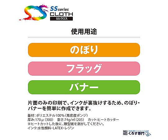 ●高発色の表現が可能です。●片面のみの印刷でもインクが裏抜けするため、のぼり・バナーを容易に作成可能です。●仕様:のぼり・フラッグ・バナー●サイズ:610mm×20m●材質:ポリエステル100%(ポンジ)●厚み:170μm●目付け:74g/m2●※本製品は一般室温環境下(温度:15~25℃、湿度:40~60%)で使用してください。
