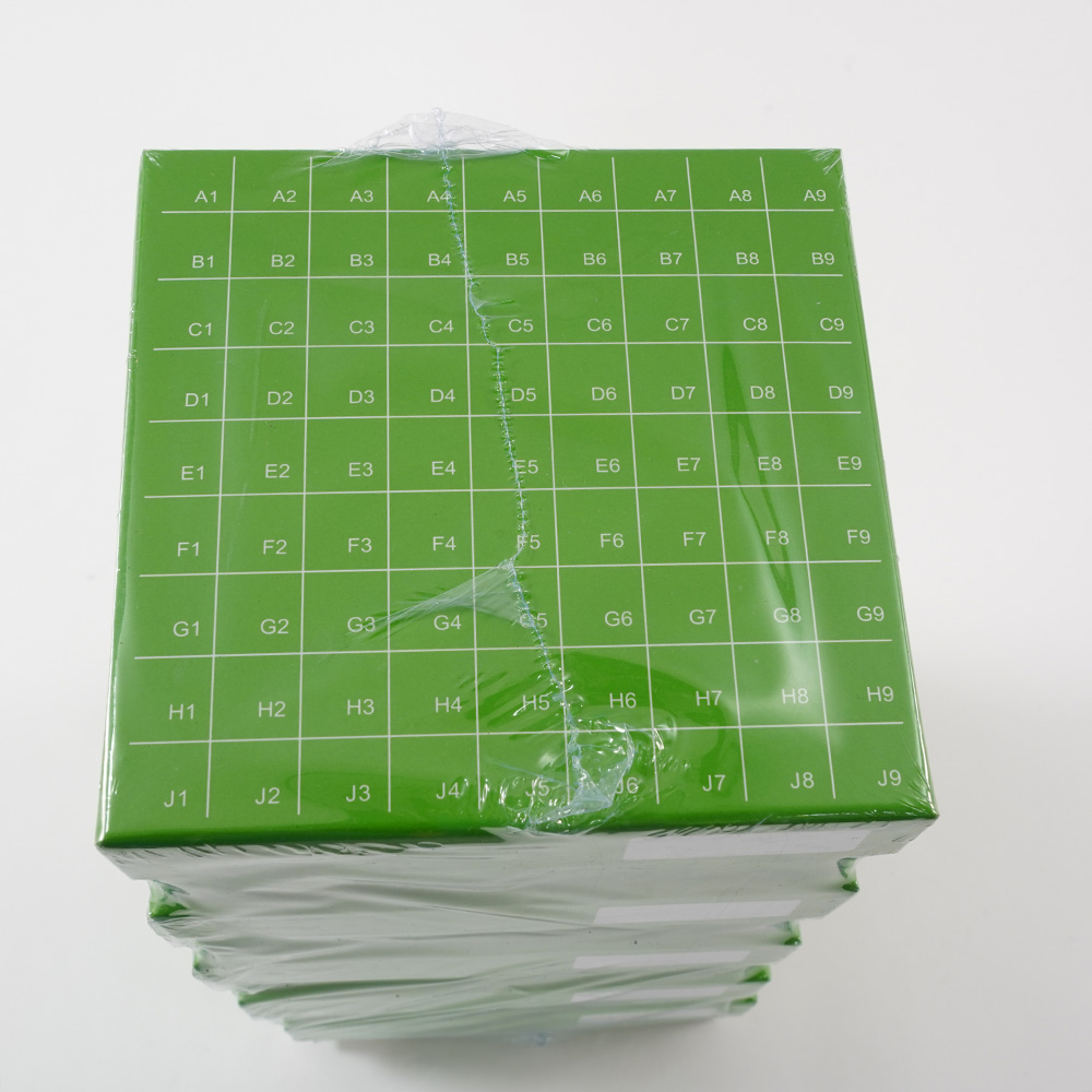 ●ヒンジタイプのフタで開け閉めが便利です。●管理に便利なアルファベットと数字が印刷されています。●耐水性コーティングが施された段ボール製で、リサイクルが可能です。●底面に排水口があります。●色:緑●入数:1パック(5個入)●材質:紙●収納数:81本(9×9)●サイズ:133×133×51(mm)●ドレイン穴付き●耐寒温度:-196℃
