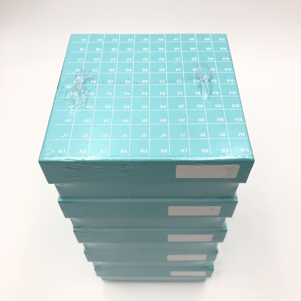 ●ヒンジタイプのフタで開け閉めが便利です。●管理に便利なアルファベットと数字が印刷されています。●耐水性コーティングが施された段ボール製で、リサイクルが可能です。●底面に排水口があります。●色:青●入数:1パック(5個入)●材質:紙●収納数:100本(10×10)●サイズ:133×133×51(mm)●ドレイン穴付き●耐寒温度:-196℃