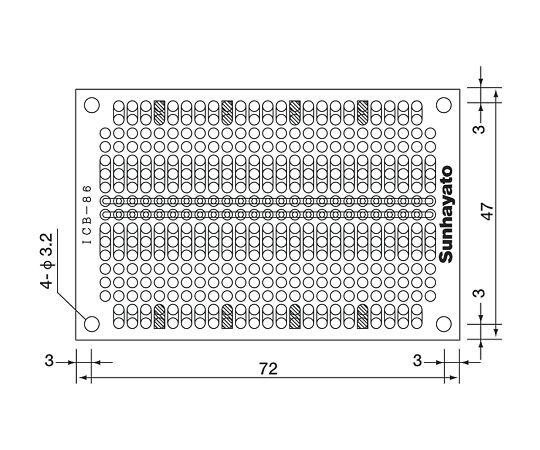 ●サイズ(mm):47×72●厚み(mm):1.6●材質:片面・紙フェノール●仕上げ処理:フラックス、部品面シルク印刷●パターン:2.54mmピッチ、ICパターン、穴径φ1.0