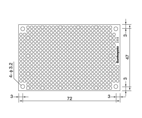 ●サイズ(mm):47×72●厚み(mm):1.2●材質:片面・ガラスコンポジット●仕上げ処理:フラックス、部品面シルク印刷●パターン:2.54mmピッチ、ドットパターン、穴径φ1.0