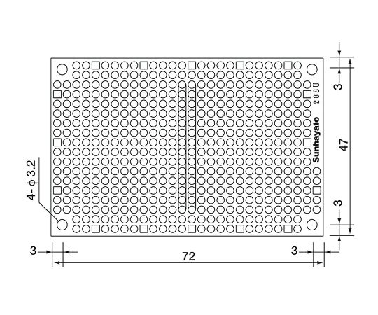 ●サイズ(mm):47×72●厚み(mm):1.2●材質:片面・ガラスコンポジット●仕上げ処理:フラックス、部品面シルク印刷●パターン:2.54mmピッチ、ドット/ICパターン、穴径φ1.0