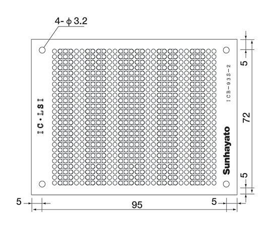 ●サイズ(mm):72×95●厚み(mm):1.6●材質:片面・紙フェノール●仕上げ処理:フラックス、部品面シルク印刷●パターン:2.54mmピッチ、連結ドットパターン、穴径φ1.0