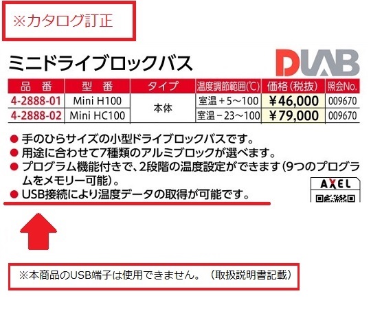 ●手のひらサイズの小型ドライブロックバスです。●用途に合わせて7種類のアルミブロックが選べます。●プログラム機能付きで、2段階の温度設定ができます(9つのプログラムをメモリー可能)。●手の平サイズでスペースも有効利用!●タイプ:本体●温度調節範囲(℃):室温+5~100●温度調節精度:±0.5℃以下●温度制御方式:PID制御●タイマー時間範囲:0~999秒/0~999分●温度上昇時間(25℃→100℃):20分以下●電源:AC100-240V 50/60Hz(ACアダプター付属)●消費電力:60W●サイズ:110×162×140mm●重量:約1kg●プログラム機能:9プログラム(各2パターン設定)●付属品:アルミブロック(18900416)