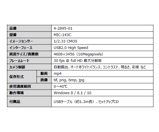 ●高画素数の画像をパソコンに表示できます。●パソコン画面でサンプルの観察と2点間距離・角度の計測ができます。●カメラ本体はCマウント接続に対応しています。別売りのアダプターを併用することで、φ23mm、φ30mm、φ30.5mm にも接続可能です。●仕様:カメラ本体●内蔵ソフト:静止画像・ビデオの取得、加工、測定機能付き●画像素子:1/2.33CMOS●画素数:最大4608×3456●サイズ:φ80×50mm●インターフェイス:高速USB2.0●電源:USB(パソコン接続)●対応OS:Windows?8/8.1/10/11●重量:320g●付属品:USBケーブル(コード長/130cm)、CD-ROM(ソフトウェア)、接続リング●※Cマウント接続のみ対応。