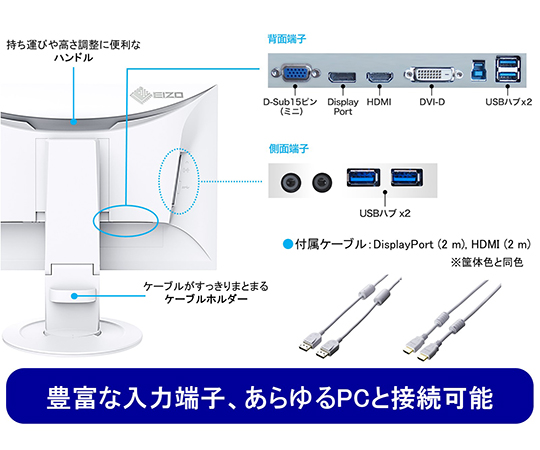 ●周囲の明るさを感知し、画面の明るさを自動で調整します。●ブルーライトカット機能が付いており、目の負担を減らします。●サイズ:23.8型●色:ブラック●種類:IPS(アンチグレア)●視野角(標準値):水平178°/垂直 178°●最大輝度(標準値):250 cd/m2●画素ピッチ:0.275 ×0.275mm●最大表示色:約1677 万色:8 bit 対応●映像入力端子:DisplayPort(HDCP1.3)HDMI(HDCP1.4)DVI-D(HDCP1.1)D-Sub 15 ピン(ミニ)●USB 機能/ USB ハブ:USB 3.1 Gen 1:Type B(アップストリーム)USB 3.1 Gen1:Type A x 4(ダウンストリーム)●昇降:140.0mm●縦回転:右回り/左回り 90°●チルト:上35°/下5°●スウィーベル:344°●電源:AC100~240V±10% 50/60Hz●本体(スタンド含む):537.8×233×333.6~473.6 mm●モニター部:537.8×53.6×320.4 mm●本体(スタンド含む):約5.9kg