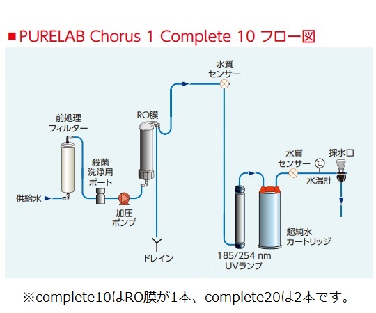 ●水道水からJIS K0557 A4グレードの超純水が採水可能です。●採水量1.5L/分のハイスピードで超純水が採水できます。●少量使用のラボならこれ1台でOK!●★外付けタンクを選択できます。(15L→品番4-3118-04,30L→品番4-3118-05,60L→品番4-3118-06,100L→品番4-3118-07)●★省スペースのために、外付けタンクを縦に積み重ねることも可能です。●★前処理カートリッジ、超純水カートリッジ、UVランプはお客様の方で交換可能●採水スピード:1.5L/分●RO水製造量(25℃):13L/時●比抵抗:18.2MΩ・cm●TOC:10ppb以下●電源:100~240V 50/60Hz 1.6A●供給水:水道水●供給水圧:0.5~2bar●★タンク水循環システム採用:○●★リアルタイムTOCシステム採用:×●●★【類似機種との違い】●★ Chorus1 Complete20 (品番:4-3114-02)●▼★RO膜が1本のため、RO水製造速度が半減している。