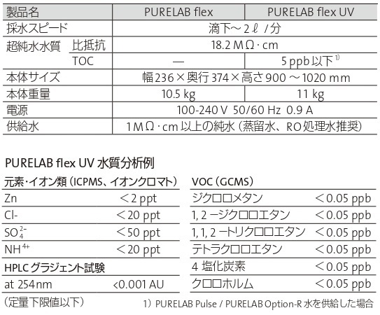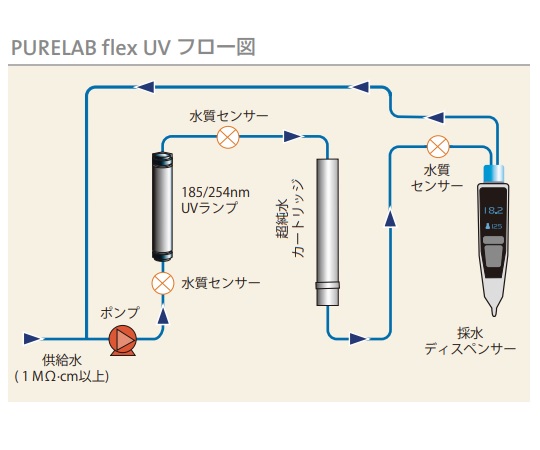 ●スリムボディに、超純水カートリッジ、TOC 低減UVランプを収納。省スペース設計です。●純水ラインや純水タンクにつなぐだけで超純水が採水可能です(JISK0557 A4 グレード)。●最大2L/ 分の高流量で、超純水を1日50L程度使用するユーザーに適しています。●ディスペンサーはピペット感覚で使用でき、自在に採水できます。●ラボのスタンダードとして、操作性を追求!●★超純水カートリッジ、UVランプはお客様の方で交換可能 ●★アームの高さを無段階調整でき、2Lのメスシリンダーを置いたまま採水できます(写真参照)。●本体サイズ(mm):236×374×900~1020●本体重量(kg):11●採水スピード:滴下~2L/分●比抵抗:18.2MΩ・cm●TOC:5ppb以下(flex UVのみ)●電源:100~240V 50/60Hz 0.9A●供給水:1MΩ・cm以上の純水(蒸留水、RO処理水推奨)●供給水圧:1.5bar以下●★リアルタイムTOCシステム採用:○●●★【類似機種との違い】●★ flexUV (品番:4-3116-01)●▼★UVランプ有による、TOCの除去率