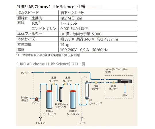 ●JIS K0557 A4(ISO3696 Grade 1)準拠●残存有機物をTOC 1ppb~3ppbまで低減化できます。●採水時の水質(比抵抗値、TOC値)をリアルタイムでモニターしていますので安心してお使いいただけます。●分画分子量5000のUFカートリッジを循環ライン内に装備し、エンドトキシンフリー水、ヌクレアーゼフリー水を採水可能です。●超感度ICPMSやLC/MS、MSの高度分析に適した超純水を提供します。●★超純水カートリッジ、UVランプ、UFカートリッジはお客様の方で交換可能●採水スピード:滴下~2L/分●比抵抗:18.2MΩ・cm●TOC:1~3ppb●エンドドキシン:0.001 EU/mL以下(Life Scienceのみ)●電源:100~240V 50/60Hz 0.9A●供給水圧:0.07~0.7bar●★リアルタイムTOCシステム採用:○●●★【類似機種との違い】●★ Chorus1 Analytical Research (品番:4-3117-01)●▼★UMFカートリッジではなく、UFカートリッジが採用されています。