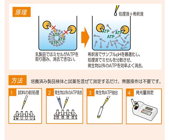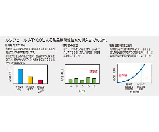 ●ルミテスターC-110(本体)と専用試薬を用いて様々な微生物検査を迅速に判定することができます。●迅速判定により検査待ち在庫を大幅圧縮し、早期出荷に対応可能です、●試薬と混ぜるだけで簡易に操作ができます。●ルシパックでは不可である微生物ATPのみの測定や乳製品の検査で必要な無菌性検査などの迅速測定が可能です。●品名:ルシフェールAT100●入数:1セット(100回測定分)●セット内容●▼100回用 発光試薬HS(高感度タイプ)×2本●▼発光試薬溶解液×2本●▼ATP抽出試薬×2本●▼ATP消去試薬×2本●▼ATP消去試薬溶解液×2本●▼希釈液×4本、処理液×2本●※海外向けの販売不可