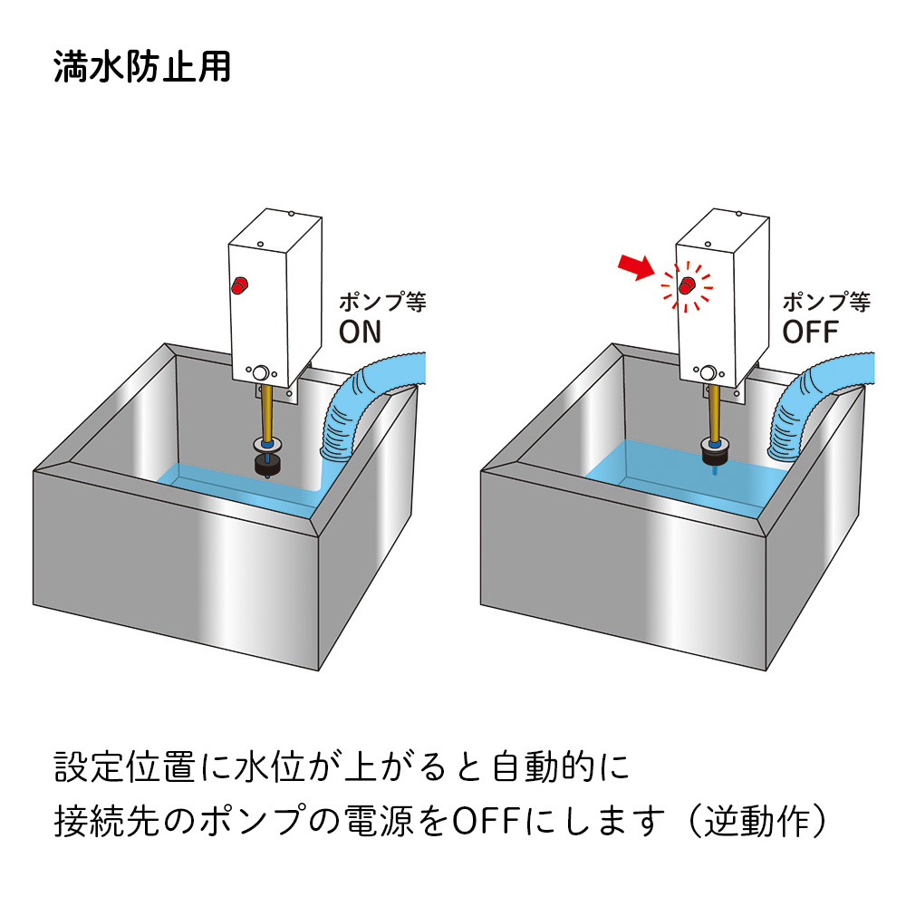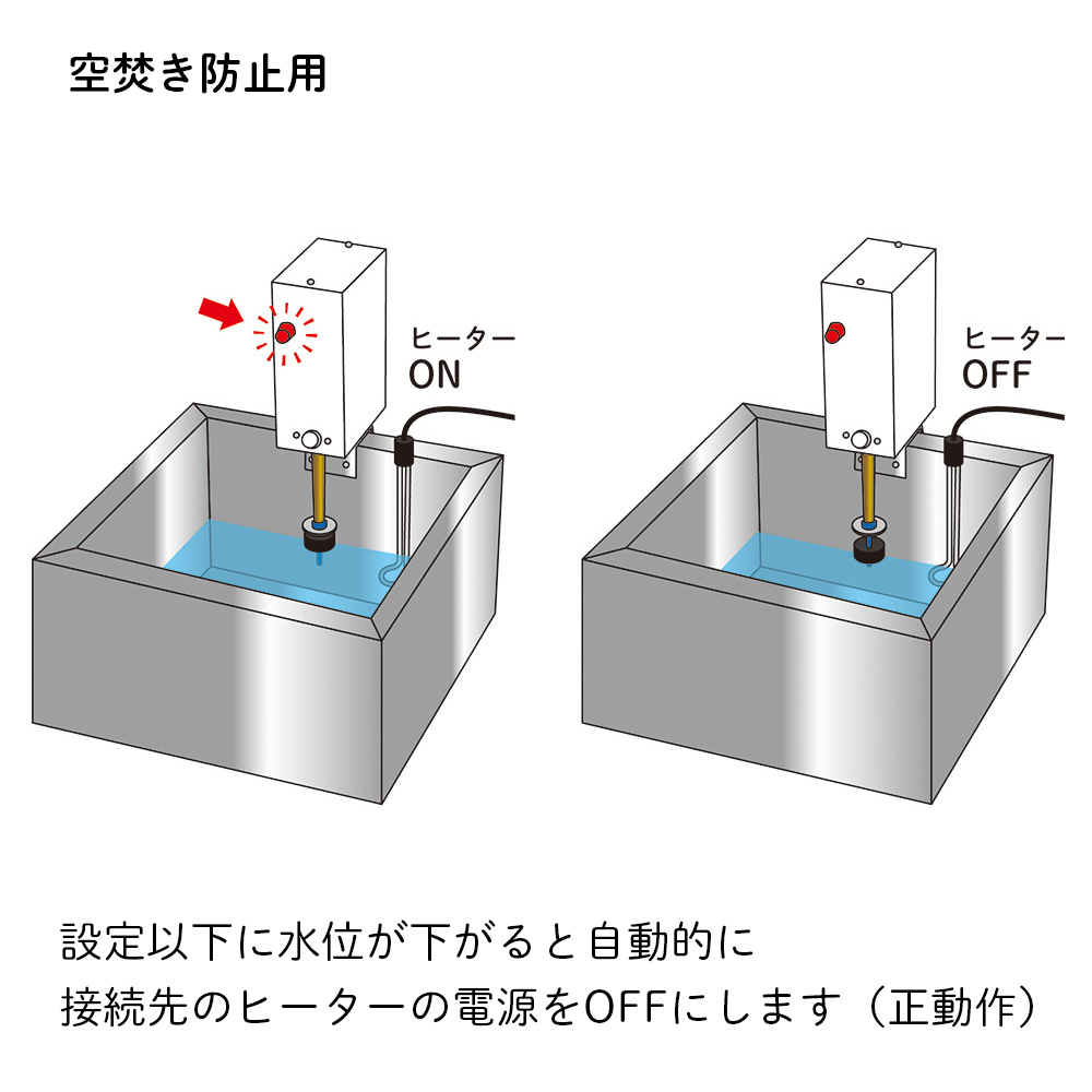 ●設定以下に水位が下がると、自動的に接続先の装置の電源をOFFにします(正動作)※空焚き防止用。●設定位置に水位が上がると、自動的に接続先の装置の電源をOFFにします(逆動作)※満水防止用。●正動作、逆動作が切り替え可能です。●恒温ユニットに接続してご使用ください。●サイズ(mm):W65×D100×H191~296(突起部を除く)●重量(kg):約1.4●材質:スチール(白色塗装)●水位検出範囲:水槽の縁より55~126mm●制御方式:フロートスイッチによるON/OFF●電源:AC100V 50/60Hz●電源コード長:2m(3Pアース付き)●制御出力:AC100V 15A●使用可能水温:80℃●取り付け可能水槽:側壁の厚さ30mm以内(水槽のフチ上面の幅は10mm以上)●付属品:取付キズ防止当て板×1枚
