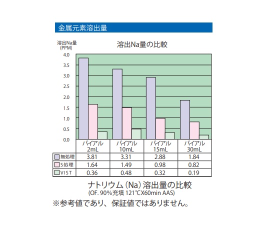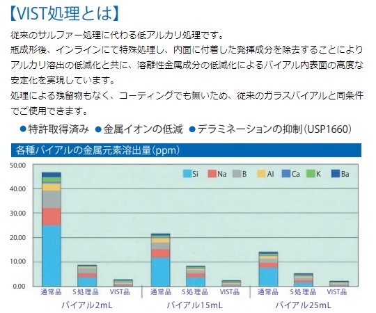 ●サルファー処理に代わる新たな低アルカリ処理(VIST)を施したバイアル瓶です。●各種金属イオンの溶出を低減し、デラミネーションを抑制したバイアル瓶です。●超純水で洗浄しクリーンパックした後、γ線で滅菌処理しています。●容量(mL):2●サイズ(mm):Φ16×33●入数:1箱(10本入)●材質:本体/硼珪酸ガラス、キャップ/PP・アルミニウム、パッキン/ブチルゴム●超純水洗浄済●γ線滅菌済●※γ線照射の影響により変色・発臭及び材質特性が変化することがございます。