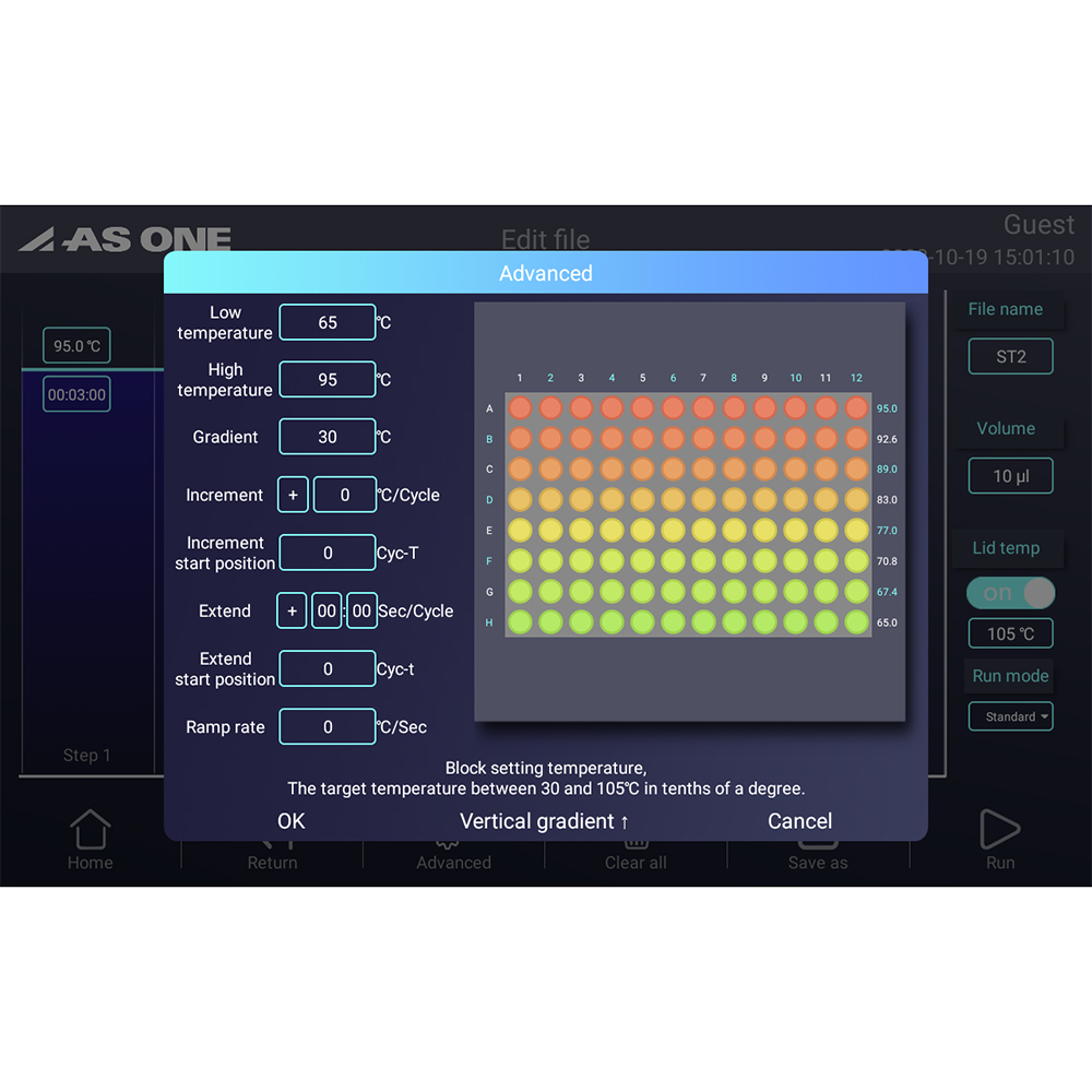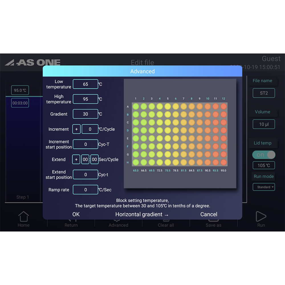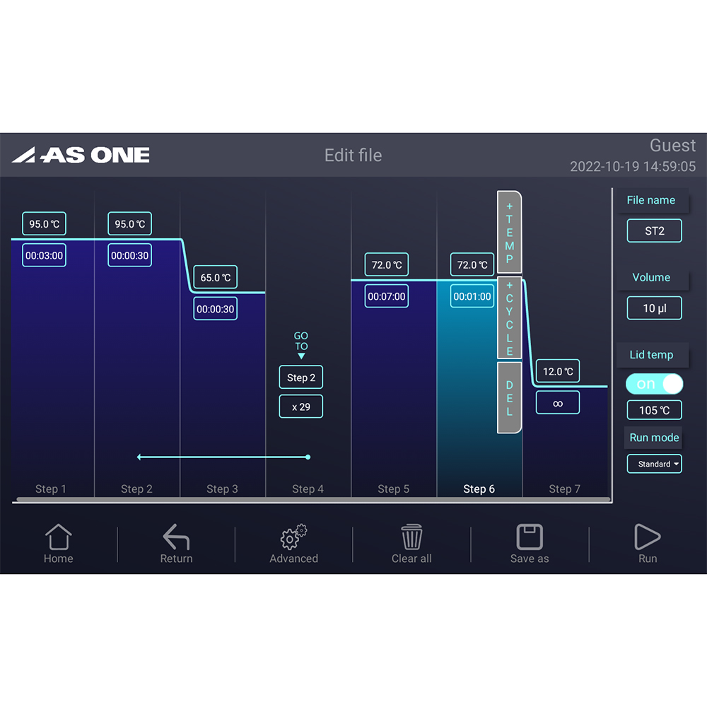 ●Point① 2Dグラジエント機能搭載で実験時間を大幅に短縮。各ステップでグラジエント方向(水平/垂直)を選択可能。●Point② 最大8℃/sの加熱速度、最大6℃/sの冷却速度でスピーディーな実験を実現。●Point③ 視認性が良く操作しやすい10.1インチの大画面タッチスクリーン搭載。●Point④ 11種類のテンプレートから容易にプロトコルを作成可能。●シンプルで使いやすいインターフェースを採用し、ストレスフリーで直感的な操作が可能です。●2Dグラジエント機能搭載で、実験効率のアップに貢献可能です。●サイズ(mm):270×385×255●重量(kg):17●★入数:1個●ブロック材質:アルミニウム●対応容器:0.2mLチューブ×96本●温度設定範囲:0~105℃●最大温度上昇速度/下降速度:8℃/sec、6℃/sec●速度調節:0.1~8℃●温度均一性:<±0.2℃●温度コントロール精度:±0.1℃●グラジエント設定範囲:30~105℃●グラジエント精度:±0.2℃●グラジエント幅:横/1~30℃、縦/1~24℃●ホットリッド温度範囲:30~115℃●プログラム容量:20,000 +(USB FLASHメモリー)●最大ステップ数:40●最大サイクル数:100●継続時間:1秒~18時間●インキュベーション機能付き●ディスプレイ:10.1インチ、1024×600ピクセル●電源:AC100-240V 50/60Hz
