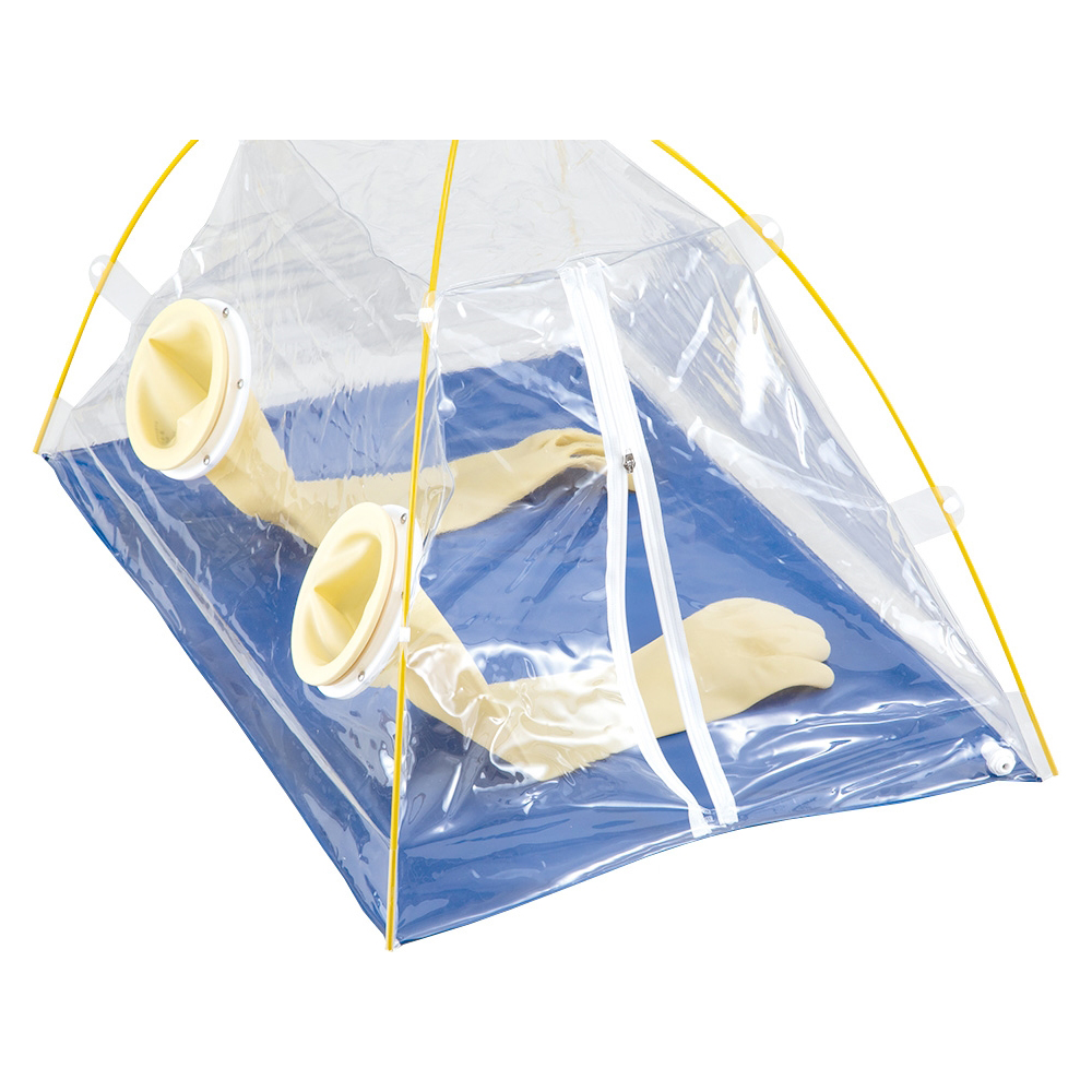 ●容易に組み立てができ、室内・外どこでも使用可能です。●手軽にガス置換ができるφ6mmチューブ用のポート付きです。●手袋は止めリングを使用せずにポートにパチンとセットできます。●上部の作業スペースが広い簡易型!●サイズ(mm):880×570×510●入数:1セット●材質:本体/PVC、手袋/ラテックスゴム●手袋ポート:内径/φ130mm、外径/φ150mm●重量:1.1kg