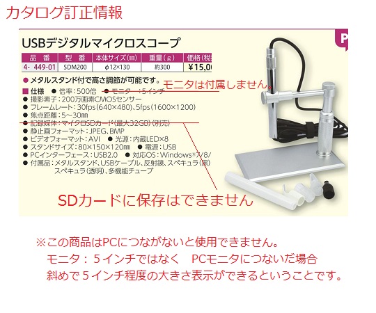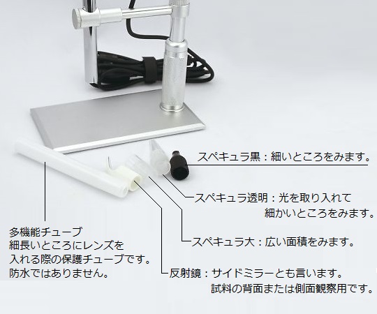 ●メタルスタンド付きで高さ調節が可能です。●本体サイズ(mm):φ12×130●重量(g):約300●倍率:500倍●撮影素子:200万画素CMOSセンサー●フレームレート:30fps(640×480)、5fps(1600×1200)●焦点距離:5~30mm●静止画フォーマット:JPEG、BMP●ビデオフォーマット:AVI●光源:内蔵LED×8●スタンドサイズ:80×150×120mm●電源:USB●PCインターフェース:USB2.0●対応OS:Windows?8/10/11●付属品:メタルスタンド、USBケーブル、反射鏡、スペキュラ(黒)、スペキュラ(透明)、多機能チューブ●※本商品を使用する際はパソコン(別売)が必要です。