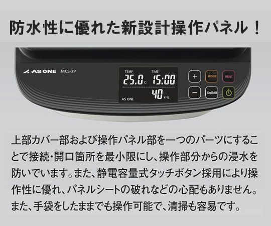 ●Point① 防水性、操作性に優れたパネル!●▼操作部分からの浸水なし●▼静電容量式タッチボタン採用で操作性に優れている●▼手袋をしたままの操作が可能●Point② 個性的で独特なデザイン●▼高いデザイン性●▼本体下部に取手として使用できる凹みあり●水に強い2大特長!※本機は完全防水構造ではありません。●CHECK 1 水が浸水しない安心構造●▼洗浄物を入れ過ぎてオーバーフローさせてしまい内部に水が浸入した、という事例が数多くあります。本機は上から流れる水が内部に侵入しない構造となっており、オーバーフロー時にも安心です。●CHECK 2 トレーに水が溜まっても動作できる●▼本体の下に水受けとしてトレーを敷いてご使用されている場面も多くあります。トレー内に溜まった水が本体下部から侵入して内部の基板が故障した、ということを防ぐため本機は本体下部40mmの位置まで浸水しても問題無く動作できる構造となっています。●筐体は耐薬品性に優れたポリプロピレン製です。●操作部はタッチ式ボタンで外部からの水の浸入を防ぎます。●オーバーフローした際に本体下部の40mmまで水に浸かっても、動作可能な構造です。●99分までの長時間タイマー付きで、減算式デジタル表示で残り時間がすぐに確認できます。●ディガス機能により、液中のガスを取り除くことができ効果的な洗浄が可能になります。●メモリー機能により、温度・時間の設定値は電源をOFFにしても記憶されています●二周波タイプは洗浄物の汚れに合わせて周波数を選択できます。●周波数自動交互運転機能付きですので、手間が掛からずより細かな洗浄が可能です。●二周波・樹脂筐体タイプ●外寸法(mm):410×395×306●槽内寸法(mm):300×240×150 ※開口寸法です。底面寸法(平滑部)は少し小さくなっています。●槽容量:約10L●材質:本体/PP、水槽/SUS304●表示:LCD(液晶)●発振回路:他励発振方式●発振子:BLT(ボルト締めランジュバン)●出力:200W●発振周波数:28kHz/40kHz●ヒーター容量:300W●電源/電源コード:AC100V 50/60Hz/1.8m(3Pプラグ)●周波数切替機能:28kHz/40kHz切替、交互運転(1分間隔)●付加機能:ヒーター機能(設定範囲:常温~60℃/1℃単位)、タイマー機能(設定範囲:1~99分/1分単位)、ディガス機能●安全機能:過電流防止、ヒーター過熱防止、過負荷防止●排水:手動排水バルブ 口径Rc1/2●付属品:洗浄カゴ×1個、フタ×1個、ホースニップル×1個●重量:約9kg