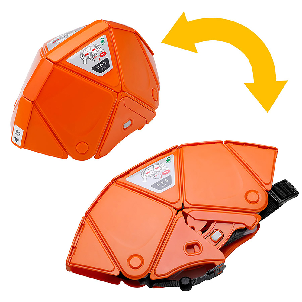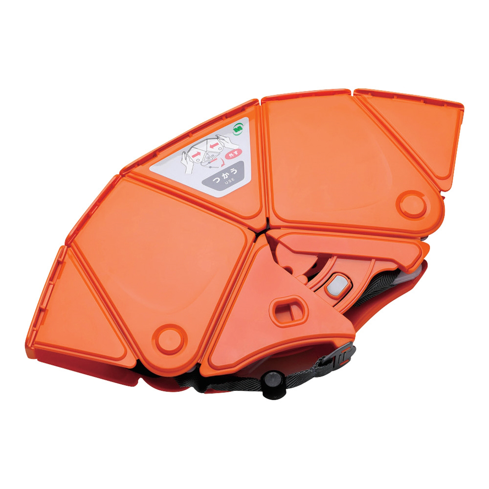 ●災害時の備えに最適。業界最薄クラスの折りたたみ防災ヘルメットです。●折りたたみ時のロック解除ボタンが外側になり、たたみやすくなりました。●ご家庭や会社・学校での備えに最適です。●収納時サイズは33mmと薄いため備蓄に適しています。●コンパクト設計なのにしっかり頭部を守ります。●フラットメットは従来のヘルメットに比べ、体積を40%も削減できます。保管スペースの大幅削減に。●パッケージごと、机の引き出しに収納可能。●収納袋付きなので、フックに下げて保管出来ます。玄関やロッカーなどに!●※本製品は乗車帽ではありません。自転車・バイク等では使用しないでください。●カラー:オレンジ●使用時サイズ(mm):約285×208×150●材質:帽体/PP、中央ジョイント部/ABS樹脂、サイドロック部/ポリカーボネート●収納時サイズ:355×203×33mm●重量:420g●国家検定合格品(飛来・落下物用)●付属品:収納袋