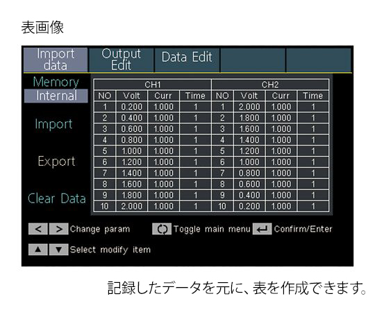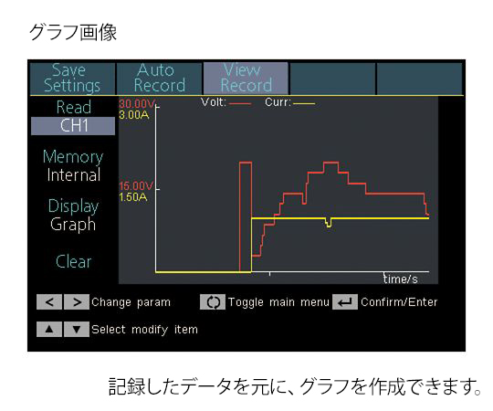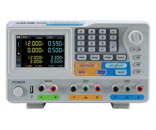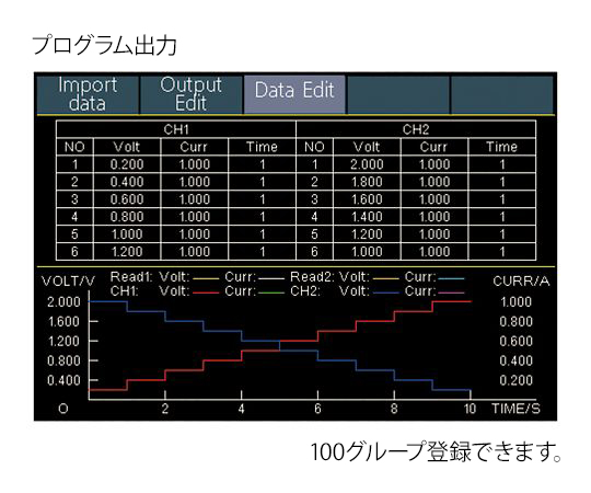 ●データ記録機能で取得したデータを表やグラフとして、画面に表示できます。●低リップル、低ノイズです。●独立3チャンネル、並列接続、直列接続が可能です。●3チャンネルは独立して制御可能です。●記録したデータを元に、グラフ・表を作成できます。●100ステップ登録できます。●出力チャンネル数:3●電圧/電流:CH1・2/0~30V/0~3A、CH3/0~6V/0~3A●設定分解能:電圧/1mV、電流/1mA●定電圧特性:入力変動/≦0.01%+3mV、負荷変動/≦0.01%+3mV、リップル&ノイズ(20Hz~20MHz)/≦1mVrms●定電流特性:入力変動/≦0.01%+3mA、負荷変動/≦0.01%+3mA、リップル&ノイズ(20Hz~20MHz)/≦5mArms●最大出力電力:198W●インターフェース:USB・RS232・LAN●機能:過電流・過電圧保護機能●ディスプレイ:4インチカラーLCD 480×320ピクセル●電源:110VAC±10% AC input 50/60Hz●サイズ:250×358×158mm●重量:約9.8kg