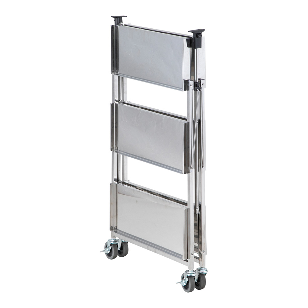 ●実験台の高さと同じ800mmのため、補助用の台としての使用、実験器具の移動や仮置きに便利です。●ステンレス製で耐薬性・耐久性に優れています。●約20mmの高さの落下防止ワク付きです。●サイドレバーを押して上に引くだけで容易に折りたため、収納に場所を取りません。●サイズ(mm):404×585×800●材質:SUS304●キャスター/φ75mmTPR製(ストッパー×2個付き)●折りたたみ時サイズ:404×210×1000mm●耐荷重:15kg/段●重量:12kg