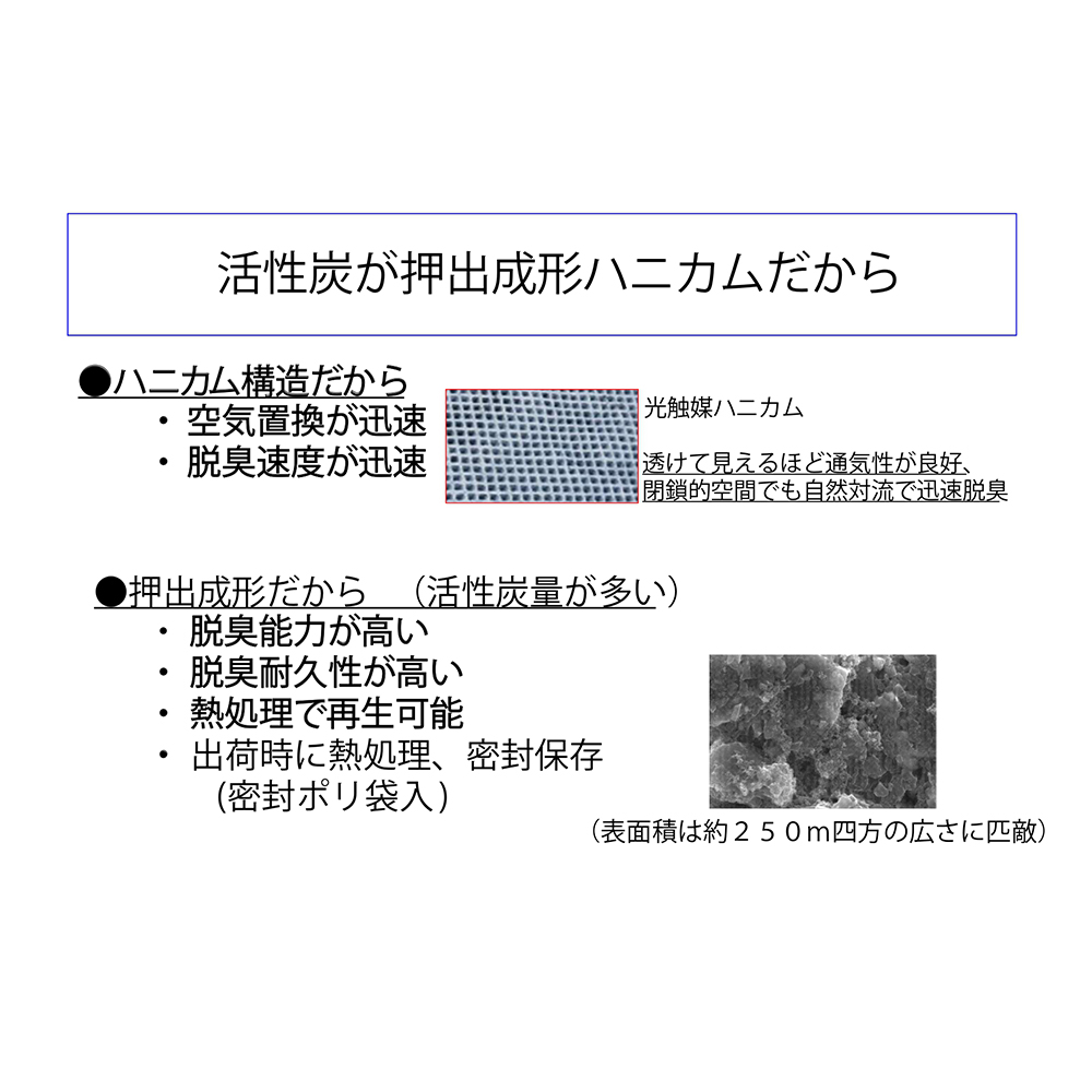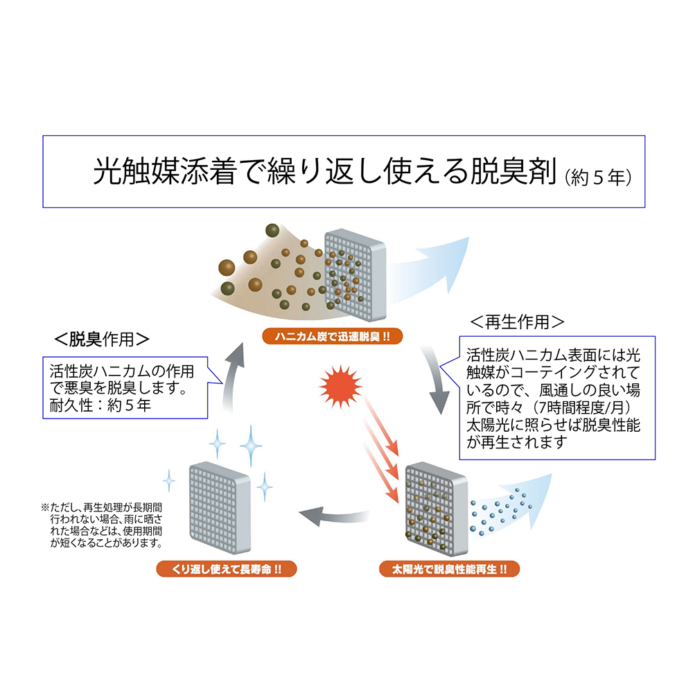 ●薬品庫や悪臭の場所に設置するだけで、脱臭効果を発揮します。●ハニカム構造の活性炭の表面に光触媒(TiO2)をコーティングした脱臭剤です。●太陽光に照らせば繰り返し使えるエコ(省エネ)商品です。●電源不要!●ハニカム構造で、太陽光でも内部まで光が照射され、再生速度が速いです。●付属のマグネットシートを貼ることで、天面・側面に取り付け可能です。●脱臭速度が速く、多様なにおい成分を脱臭し繰り返し使用可能です。●サイズ(mm):約123×127×34●重量(kg):0.2●材質:脱臭剤/活性炭・二酸化チタン、ケース/PE●有効期間:約5年間※1●付属品:マグネットシール●※1:有効期間は参考値であり、使用環境によって異なります。