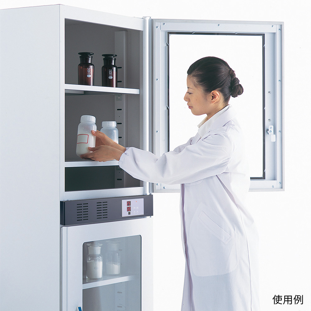 ●丈夫なスチール製で高精度の湿度管理が可能!●新型除湿ユニットで、省エネ・省スペースを実現!●新型扉開閉機構扉開閉時のデッドスペースを無くしました。●安定した湿度管理を行いたい各種試料・精密機器・半導体関連商品の保管に。簡易な低湿度特性評価試験に。●省エネルギー●▼固体高分子電解質膜の有効面積をさらに拡大し、除湿機能のパワーアップと除湿スピードを高めました。●水滴が出ない●▼水分は直接気体状態で外部へ放出されますので、水滴(ドレン)が出ません。●無騒音●▼新型除湿ユニットには駆動部が無く音や振動の発生源もありませんので、耐久性に優れています。●湿度表示●▼設定値(SV)と測定値(PV)の2段デジタル表示を採用しています。●外寸法(mm):600×659×1800●内寸法(mm):540×600×1510●★※木製の梱包(木枠・パレット等)を使用しています。●除湿方式:固体高分子電解除湿素子(ロサール?)によるH2O電機分解排出●除湿能力(30%RH設定時):12時間以内●▼※庫内無負荷・室外環境25℃60%RHの外気開放時からの参考です(外気条件によって変化します)。●湿度設定範囲:10~60%RH●湿度制御範囲:25%RH~室内湿度●▼※庫内無負荷・室外環境25℃60%RH時での参考値です(外気条件によって変化します)。●測定範囲:0~60℃/10~60%RH●温湿度センサー:温度/サーミスタ素子、湿度/抵抗型低湿測定用センサー●除湿素子面積:約49cm2●湿度制御方式:マイコン式ON/OFF制御●温湿度表示精度:±1℃(25℃~40℃)/±5%RH(15~40%RH at25℃)●▼※湿度が10%未満の場合、湿度表示は「LL」。60%RH超過の場合、湿度表示は「HH」表示になります。●表示分解能:1℃/1%RH●サンプリングインターバル:0.5sec●材質:本体・制御ユニット/スチール塗装仕上げ、前面窓/強化ガラス●棚板寸法:536×600mm●棚板取付けピッチ(最小棚板間隔):60mm(40mm)●棚板仕様:スチール鋼板●棚板耐荷重:約40kg/枚(等分布荷重時)●安全装置:固体高分子電解除湿素子の個別動作異常エラー表示機能(短絡・断線時)・過電流ヒューズ●電源:AC100V 50/60Hz●消費電力:約34W●電源コード長:約2m(3Pプラグ・本体アース処理済み)●キャスター:φ100mmハードゴム製(ストッパー×2個付き)●重量:70kg●付属品:スチール製棚板×4枚●※運送費・搬入費・据付費・組立費等が別途必要です。お問い合わせください。