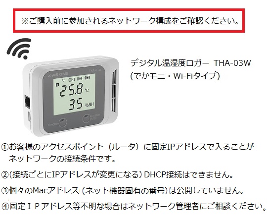 ●メモリタイプにWi-Fi無線接続が可能になったモデルです。●コンパクトなボディながら大きなデジタル表示。本体奥行により据置型に便利です。●広域な湿度域(10~90%RH)の相対湿度を±3%RH(Typ)で測定します。●電池残量の目安がひと目で確認できます。●メモリ残量の目安がひと目で確認できます。●モニター表示は最大30秒更新。5パターンの表示モードから選択が可能。●本体設定用アプリケーション(THA Series Setter)を使って、USB端子より記録したログの取り出しが可能で、この端子は給電ポートとしても使用できます。●別売センサーを用いて離れた場所も計測可能で、本体側との2CH計測が可能になります。●PCモニタリング用アプリケーション(THA Log Monitor)を使用することにより、Wi-Fi及びUSB経由でリアルタイムのグラフ/リスト表示が可能になります。(モニタリング時の記録間隔は5秒~)(最大6温湿度の計測が可能。内部外部使用時最大3台/内部のみ最大6台)※Wi-Fi経由でのログの抽出も可能になります。(記録中不可)●使用温湿度範囲:温度/0~60℃、湿度/90%RH以下(結露しないこと)●測定温湿度範囲:温度/-10~70℃、湿度/0~90%RH●表示分解能:温度/0.1℃、湿度/1%RH●参考表示精度:●▼温度/±0.3℃(Typ)、±0.5℃(Max)(0~60℃)●▼湿度/±3%RH(Typ)、±5%RH(Max)(25℃・10~90%RH)●▼※本機の校正点は50%RH@25℃時(温度±0.5℃/湿度±5%)1点となります。●サンプリングインターバル:1秒/5秒/10秒/30秒/1分/5分/10分/30分/60分●測定記録点数:最大約8,000点(1サンプリング周期で1点)●センサー:●▼感温部/バンドギャップ式半導体センサー●▼感湿部/静電容量式薄膜湿度センサー●サイズ:本体/110×32×77mm、表示部/52×40mm●電源:単3形アルカリ電池4本(テスト用付属)●接続端子:外部センサー用モジュラージャック、USB(Mini-B)●重量:約250g(電池4本含む)●材質:ABS●アプリケーションソフト:●▼本体設定用/THA Series Setter●▼PCモニタリング用/THA Log Monitor●▼共にWindows(R)7/8/8.1/10/11(32/64bit)にて動作。●●本体設定用アプリケーション(THA Series Setter 2.0.1)のダウンロードはこちらから●PCモニタリング用アプリケーション(THA Log Monitor v2.01)のダウンロードはこちらから