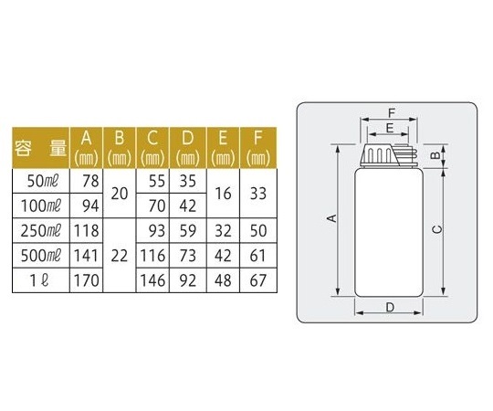 ●ノーパッキン(中栓無し)ですが、液モレはありません。●容量:100mL●A(mm):94●B(mm):20●C(mm):70●D(mm):42●E(mm):16●F:33mm●材質:本体・フタ/PE(ポリエチレン)●耐熱温度:110℃●液モレテスト合格済み●目盛付き●入数:1本入