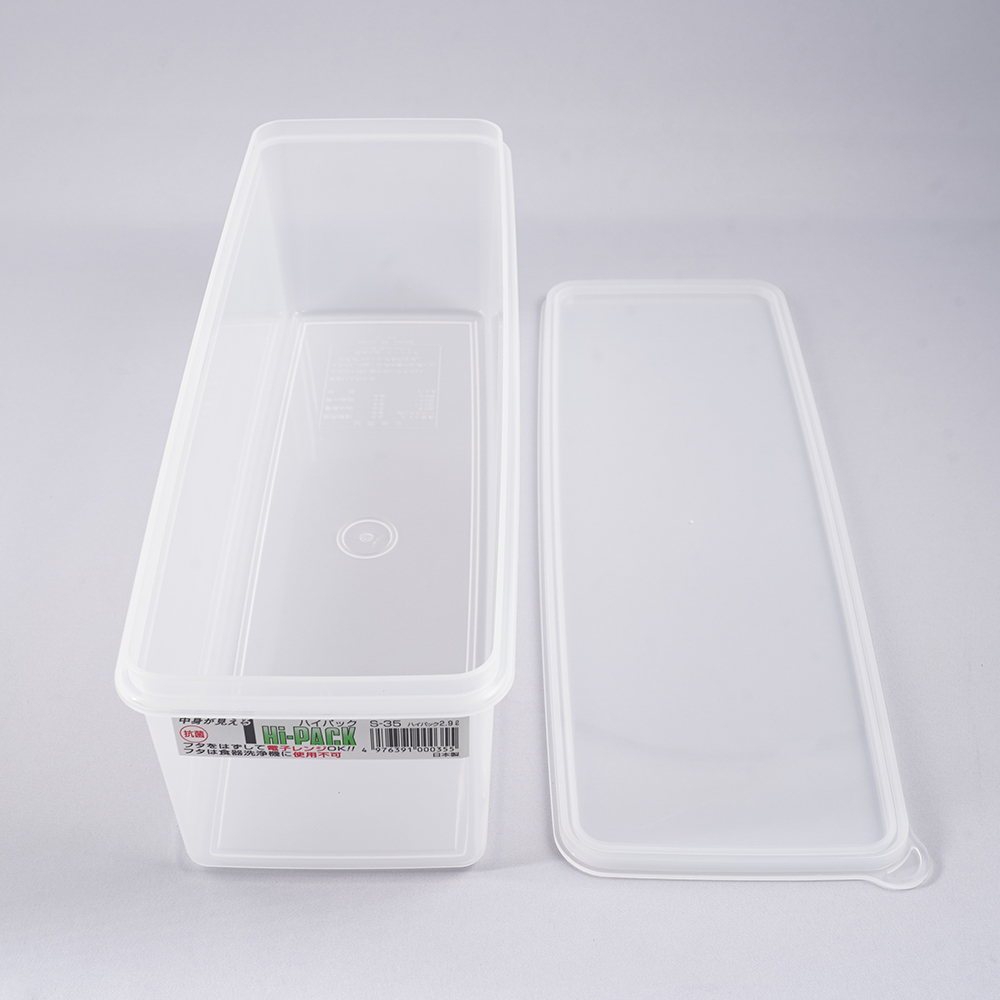 ●容量(mL):2900●外寸法(mm):328×116×99●内寸法(mm):318×130×97●材質:本体/PP(ポリプロピレン)、フタ/EVA(酢酸ビニル)●電子レンジ:本体/可、フタ/不可●耐熱温度:本体/120℃、フタ/60℃●食洗器:本体/可、フタ/不可●BPAフリー(ビスフェノールAを含みません)●コード番号:S-35