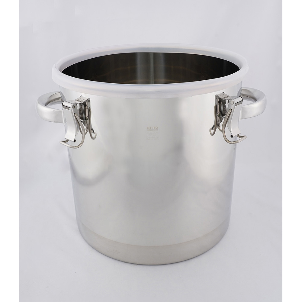 ●内容物の飛散防止や湿気を嫌う内容物の保管に適しています。●クリップは容器に付いているため、フタを外した際に場所を取りません。●材質:本体・フタ/ステンレス(SUS304)、パッキン/シリコンゴム(食品衛生法適合)●フタ締め付け数:4個●容量:25L●内径×高さ×板厚:φ330×330×0.8mm●重量:4.0kg●表面処理:内外面バフ研磨●把手タイプ・SUS304●※継手、蛇口等の追加工、高さ変更の特注製作が可能です。●★※名入れ対応可