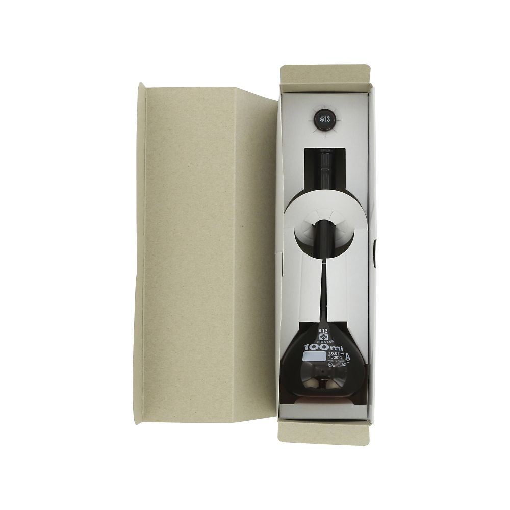 ●一定の体積を測るために用いられます。全量フラスコとも呼ばれます。●底の平らなフラスコに細長い首が伸びた形状で、首の部分に通常は1本の回線があります。●目盛のある首部分の径が細いため、同容量のメスシリンダーより目盛の精度が高いです。●一定の試薬濃度を正確に調整する時に使用されます。●目盛は受入体積(入っている体積)を表し、受用(入用)を意味するTCが表示しています。(TC:To Contain の略)目盛は20℃の水を測定したときの体積を表します。●JIS規格(R3505)クラスAの「体積の許容誤差」より高精度です。●遮光を目的として外側に茶染めを施しております。●材質:硼珪酸ガラス-2●TSガラス平栓付●全高:180mm●容量:100mL●色:茶●体積許容誤差:±0.08mL●栓(TS):13●外径:φ60mm●※JIS R3505(1994年)クラスAの「体積許容誤差」より高精度で製作しています。●●★※安全対策として、飛散防止を目的としたガラスコーティング対応が可能です。詳しくは下記までお問い合わせください。●●★アズワン株式会社▼サービスプロモーショングループ●★E-mail:tokuchu@so.as-1.co.jp●コード番号:020070-100