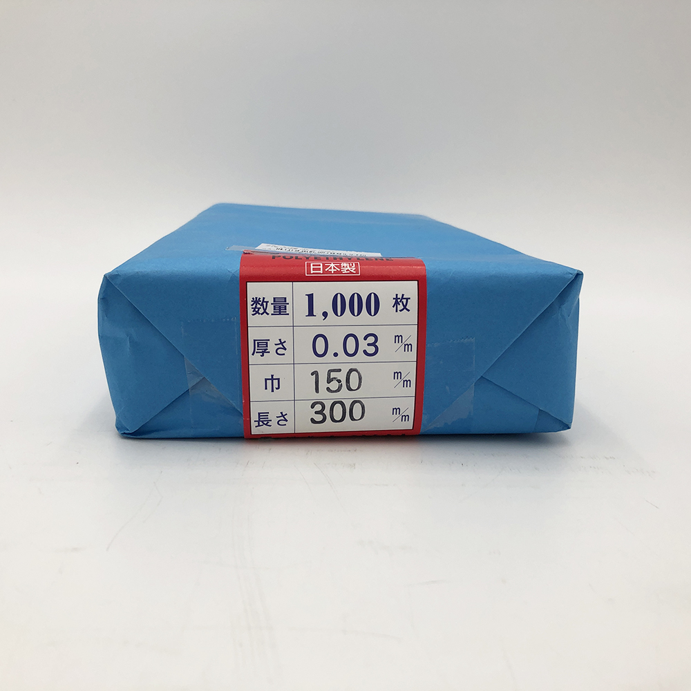 ●材質:PE(ポリエチレン)●サイズ(mm):150×300●厚み(mm):0.03●重量(1枚当たり):2.49g●入数:1包(1000枚入)