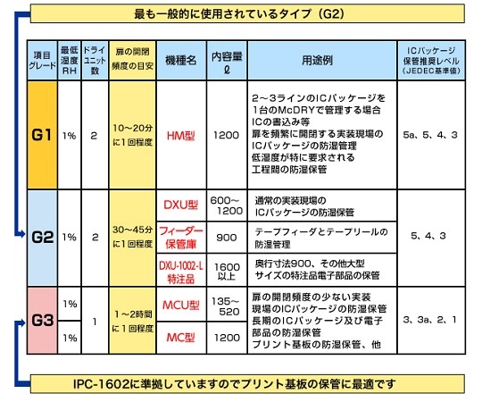 ●ICパッケージやLED等のMSL部品の防湿管理にドライボックスが適しています。●急速除湿ドライユニット1個付きです●定期校正可能な湿度計での湿度管理(停電時でも表示)●扉の開閉頻度1時間~2時間に1回程度の現場に適しています●扉の開閉頻度の少ない長期防湿保管用に適しています●実装現場でのICパッケージやLED等のMSL部品、プリント基板の低湿度保管、金属部品の錆防止・酸化防止、樹脂系・金属系材料の吸湿防止に適しています●外寸法(mm):500×630×1200●内寸法(mm):480×600×1080●到達湿度:1%RH●材質:スチール導電塗装(色:アイボリー)●扉(マグネット式):ガラス扉×2枚●電源・消費電力:AC100V・MAX240W●コンセント形状:3Pプラグ●棚板耐荷重:50kg/枚●棚板ピッチ:30mm●重量:60kg●付属品:棚板×8枚・鍵・アース端子・湿度計
