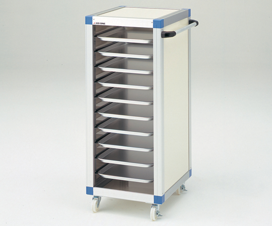 ●抜き差し可能なアルミトレーを棚板にしたキャスター付きワゴンです。●材質:本体フレーム・トレー/耐食アルマイト処理アルミニウム、天板・側板・底板/PVC(塩化ビニル樹脂)●キャスター:φ65mmPA(ナイロン)製(ストッパー×2個付き)●トレー外寸法:308×418×22mm●トレー間隔:75mm●総耐荷重:約50kg、トレー耐荷重/約5kg/枚●重量:16kg●付属トレー数:10枚●サイズ(mm)※1:397(452)×460×965●トレー収納数:10段×1列●※1 ( )内はハンドルを含む