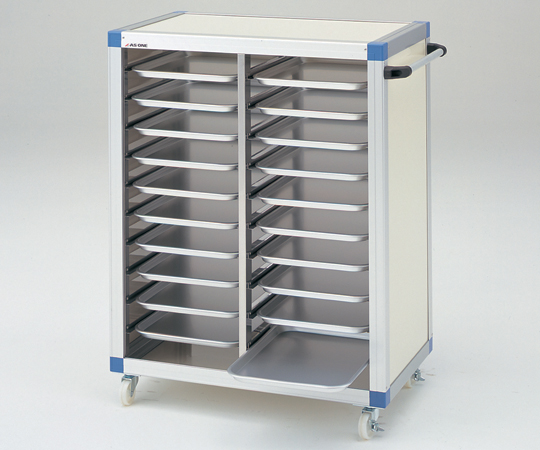 ●抜き差し可能なアルミトレーを棚板にしたキャスター付きワゴンです。●材質:本体フレーム・トレー/耐食アルマイト処理アルミニウム、天板・側板・底板/PVC(塩化ビニル樹脂)●キャスター:φ65mmPA(ナイロン)製(ストッパー×2個付き)●トレー外寸法:308×418×22mm●トレー間隔:75mm●総耐荷重:約70kg、トレー耐荷重/約5kg/枚●重量:24kg●付属トレー数:20枚●サイズ(mm)※1:734(789)×460×965●トレー収納数:10段×2列●※1 ( )内はハンドルを含む