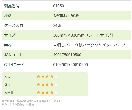 ●多量な水・油などの汚れを素早く確実に吸収します。●材質:パルプ・リサイクルパルプ●入数:1ケース(50枚/束×24束入)●タイプ:EF4つ折り4プライ●サイズ:380mm×330mm●※食品衛生法に準じた試験を実施した商品です。