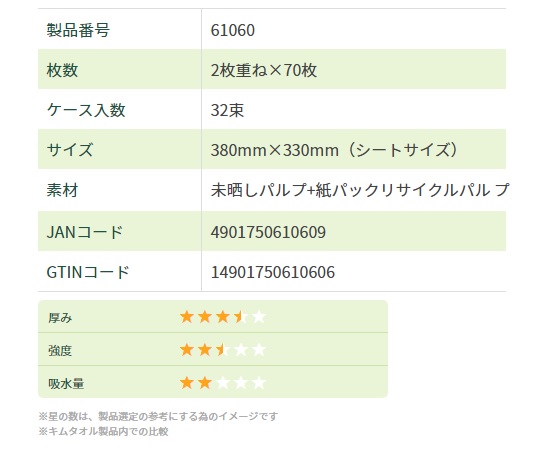 ●多量な水・油などの汚れを素早く確実に吸収します。●型番:61060●材質:パルプ・リサイクルパルプ●入数:1ケース(70枚/束×32束入)●タイプ:EF4つ折り2プライ●サイズ:380mm×330mm●※食品衛生法に準じた試験を実施した商品です。