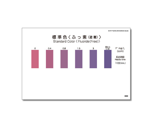 ●蒸留分離抽出液及び自然水等、共存物質の少ない検水に適しています。●検水中のイオン状態(F^-)のフッ素が容易に測定できます。●型番:WAK-F●測定項目:ふっ素(遊離)●測定回数:50●簡易水質検査器具●★測定原理:ランタン-アリザリンコンプレキソン比色法 ●★測定目盛:0、0.4、0.8、1.5、3、8以上 mg/L●★測定時間:7分●★内容:チューブ50本(5本入りラミネート袋 10袋)、標準色 1枚、保存袋、使用法 1部