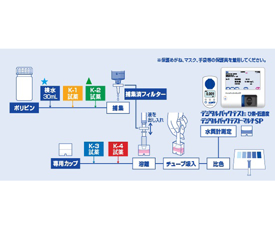 ●環境基準0.01mg/Lから一律排水基準0.1mg/Lレベルのひ素を測定できる簡易水質分析器です。●測定項目:ひ素(低濃度)●測定回数(回):20●簡易水質検査器具●★測定原理:APDCによる膜分離濃縮/モリブデン青比色法●★測定目盛:As 0.01、0.02、0.05、0.1、0.2、0.5、1 mg/L ●★測定時間:約10分●★内容:フィルター 20個、ポリビン 1本、専用カップ 1個、30mLシリンジ 1本、1mLシリンジ 1本、K-1試薬 1本、K-2試薬 1本、K-3試薬 1本、K-4試薬 1本、ノズル 1本、ピペット 2本、チューブ 20回分(5本入りラミネート袋 4袋) 、保存袋 1枚、標準色 1枚、使用法 1枚●★注意点:保護メガネ、マスク、手袋等の保護具の着用、室内換気の厳守