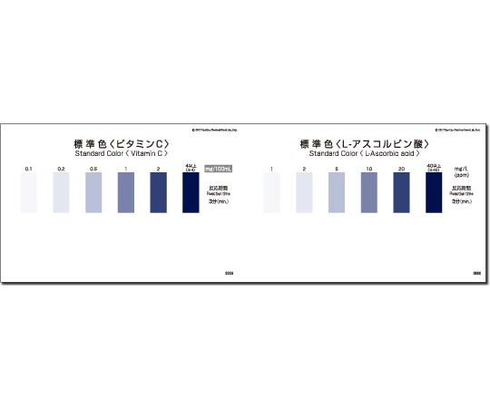 ●果汁を含む飲料や工程水など、その他の還元性物質を含まない検水中のビタミンC(アスコルビン酸)を簡単な操作で測定することができます。●測定項目:ビタミンC(アスコルビン酸)●測定回数:40●★測定原理:フォーリン-デニス比色法●★測定目盛:●▼<ビタミンC> 0.1、0.2、0.5、1、2、4以上 mg/100mL●▼<アスコルビン酸> 1、2、5、10、20、40以上 mg/L●★測定時間:3 分●★内容:チューブ 40本(5本入りラミネート袋 8袋)、 K-1試薬(液体) 1本、専用カップ 1個、標準色 1枚、使用法 1部