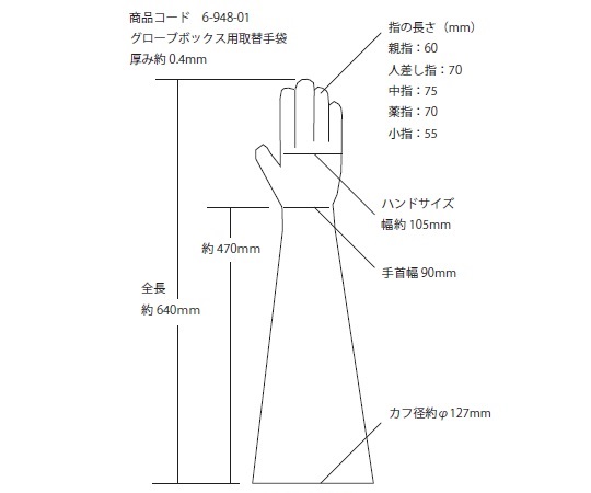 ●★最もゴムらしい弾力性を持っている。機械的強度・伸縮性がよい●取替用手袋●全長(mm):640●材質:天然ゴム●カフ部内径:φ130mm●厚み:0.4mm●パウダー付●入数:1双