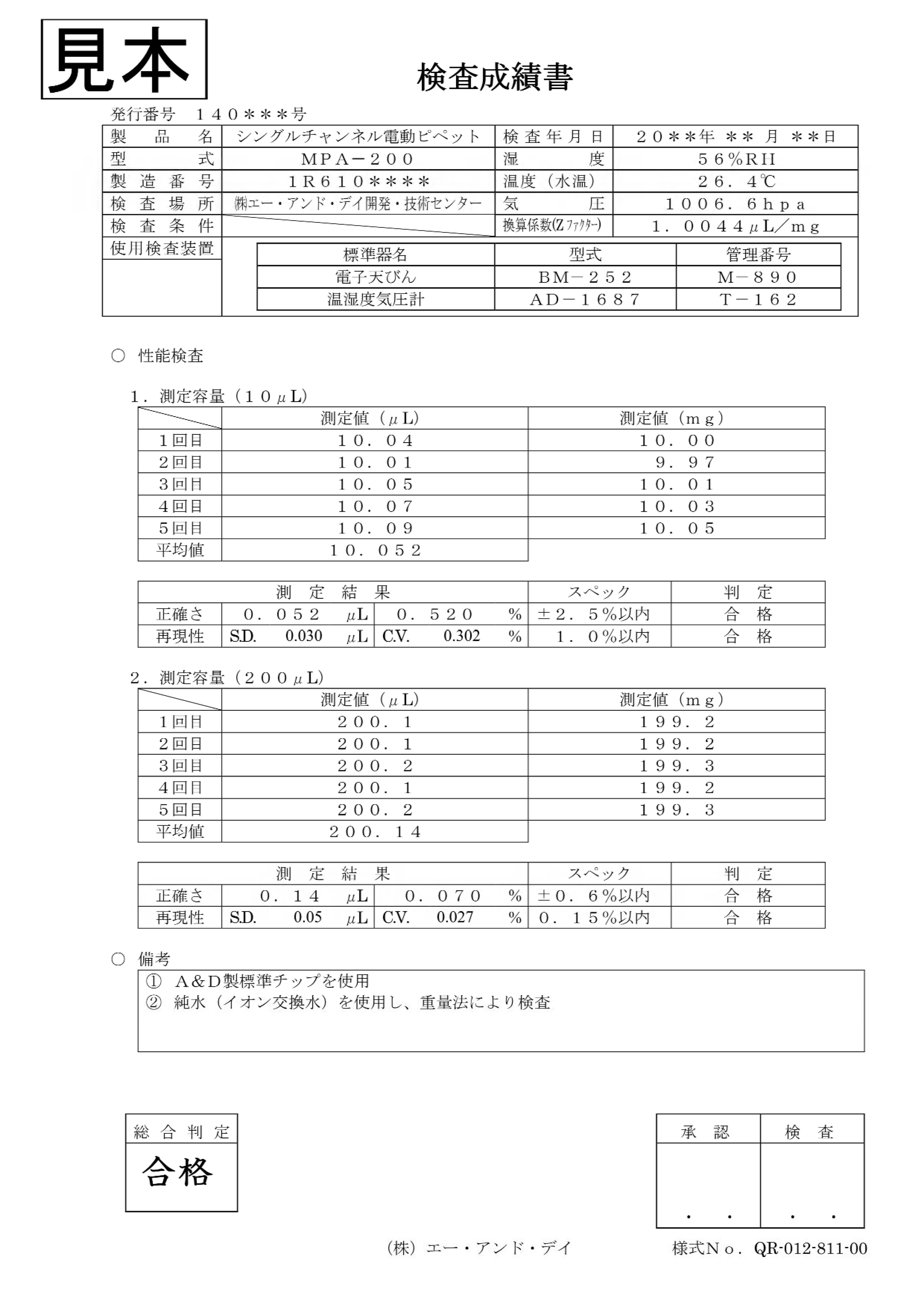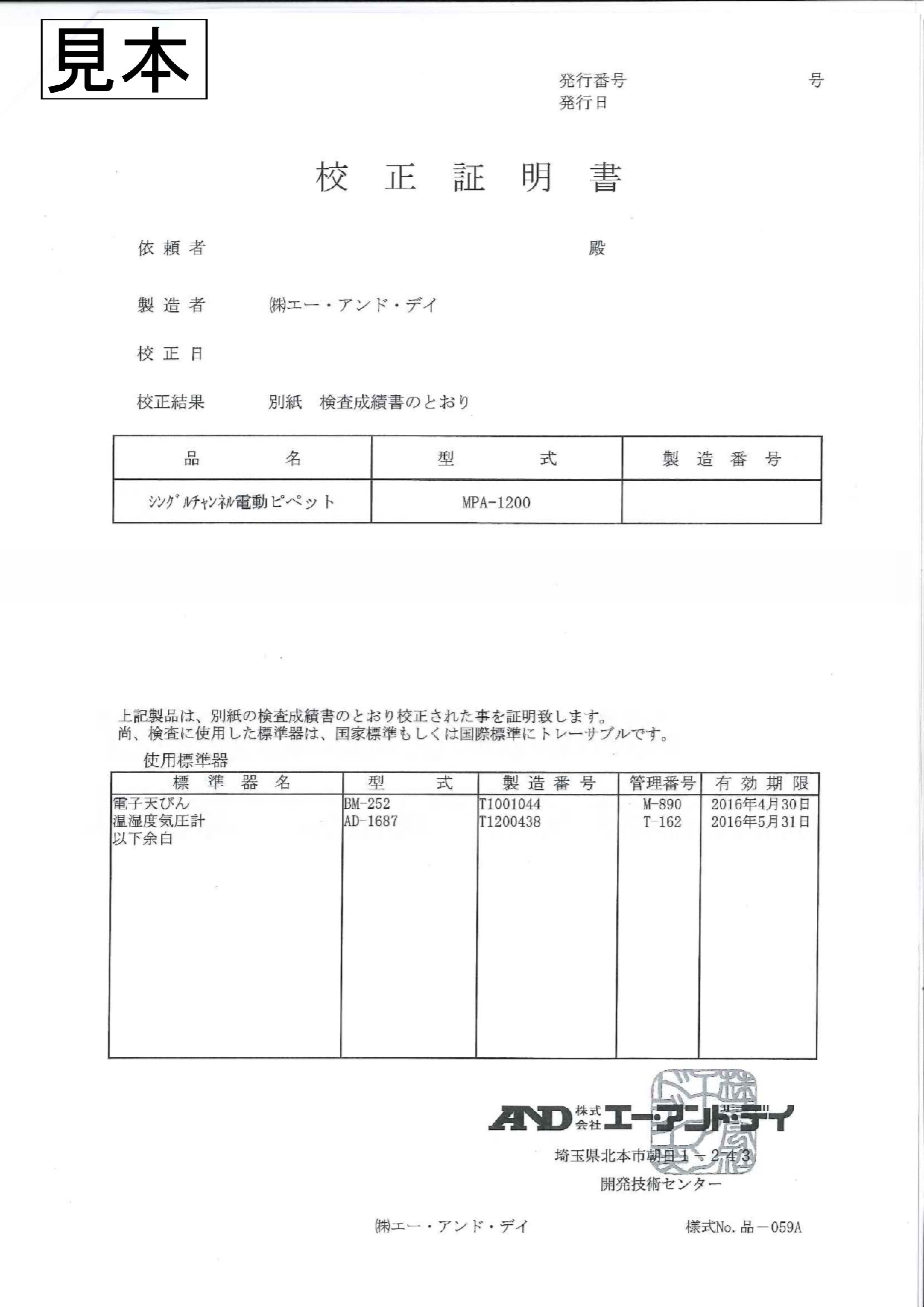 ●一般校正証明書付き(校正ポイント3点×10回)です。●電動式で、高い再現性を実現します。●親指でピストンを上下させる動作ではなく、人差し指によるボタン操作で「疲れにくさ」を徹底的に追及しました。●ユーザーCAL機能で簡単に分注容量の校正(調整)が可能です。●容量(μL)の他に質量(mg)でも分注量を校正、表示することが可能です。この機能により、固体や粉体といった、質量管理している試料と液体を混合する際にも、単位の互換性が取れます。●有機溶剤・酸性にも強い設計です。●連続分注機能、ミキシングやリバース操作など便利な機能付きです。●独自のプレディスペンス機能により、最初の捨て分注が不要です。●四隅の衝撃プロテクターで、落下による液晶ディスプレイの破損を防止します。●ロアパーツの交換(オートクレーブ・修理交換)が可能です。●容量範囲:0.1~10.0mL●最小可変容量:0.01mL●性能:1.0mL時【正確さ±2.5%/再現性(CV)0.6%】 / 5.0mL時【正確さ±1.0%/再現性(CV)0.15%】 / 10.0mL時【正確さ±0.5%/再現性(CV)0.15%】●最大分注回数(連続分注):0.1mL×99回●動作モード:標準モード(AUTO)、連続分注モード(MD)、混合モード(MIX)、分注混合モード(AUTO+MIX)、シーケンシャル吸引モード(SA)、シーケンシャル排出モード(SD)●プログラムメモリ:9種類設定可能●分注スピード:5段階調整●最大分注回数(フル充電にて):約1,800回 ※標準モード、吸引・排出スピード最速設定にて●電源:リチウムイオン電池 3.7V/920mAh(付属)●校正ポイント:3点(1mL、5mL、10mL)●校正回数:10回●付属品:取扱説明書、簡易操作ガイド、成績書、電池、マルチプラグ付きACアダプタ(兼充電用)、電源ケーブル、チップ、ネームステッカー、一般校正証明書(※依頼者名及び住所は空欄です)●※受注生産品の為、ご注文後のキャンセル及び返品・返却はお受けいたしかねます。