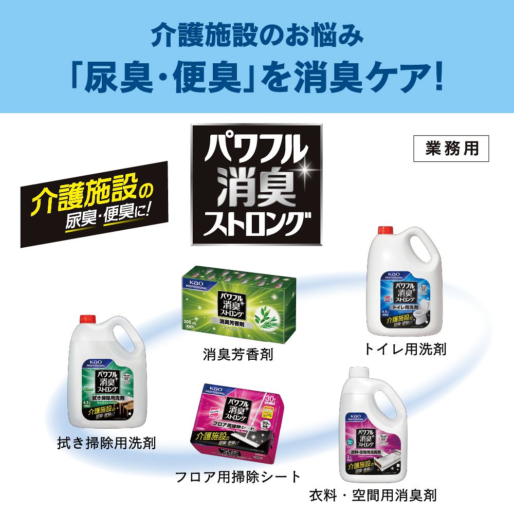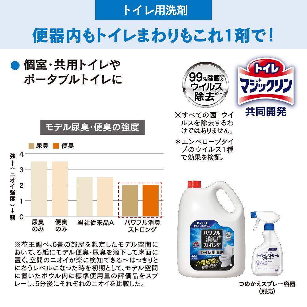 ●尿臭・便臭をしっかり消臭するトイレ用洗剤●尿臭・便臭をガードする独自香料が悪臭を弱め、取り込んで良い香りに変化させる「悪臭ガードハーモセント技術」を採用。●中身正味量:4.5L●成分:界面活性剤(4%、アルキルベタイン)、泡調整剤、安定化剤、金属封鎖剤●※使用時は必ず花王指定の業務用つめかえスプレー容器(別売)または、壁付けタイプの専用ディスペンサー(別売)に移し替えてお使いください。